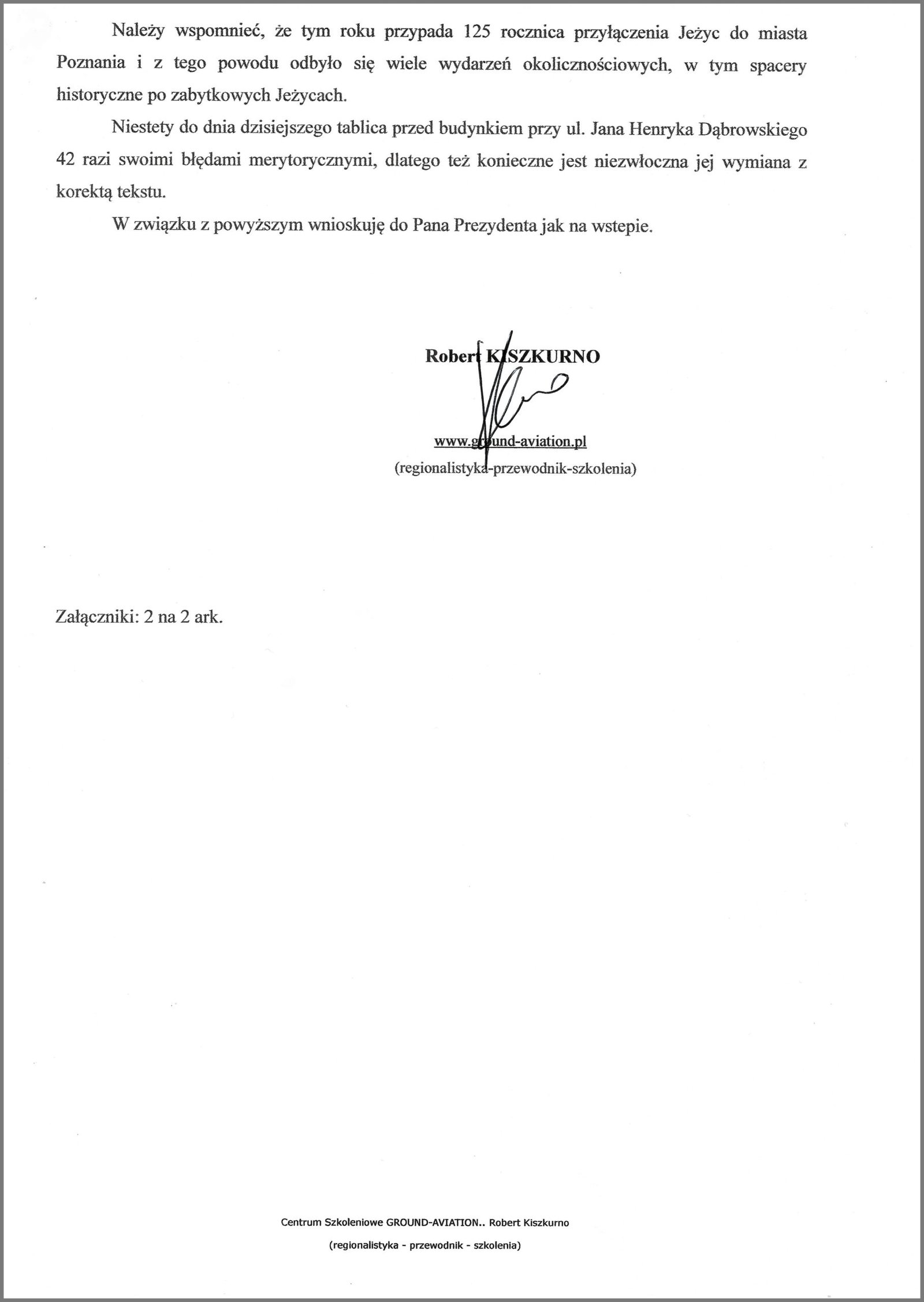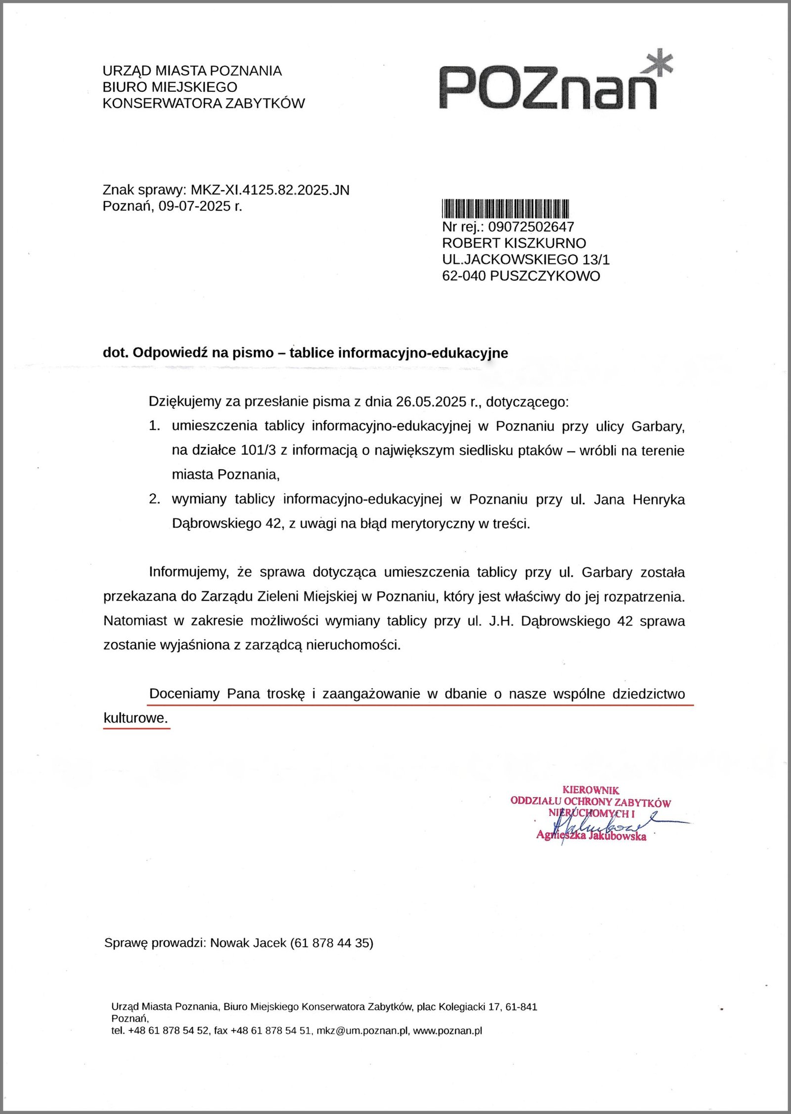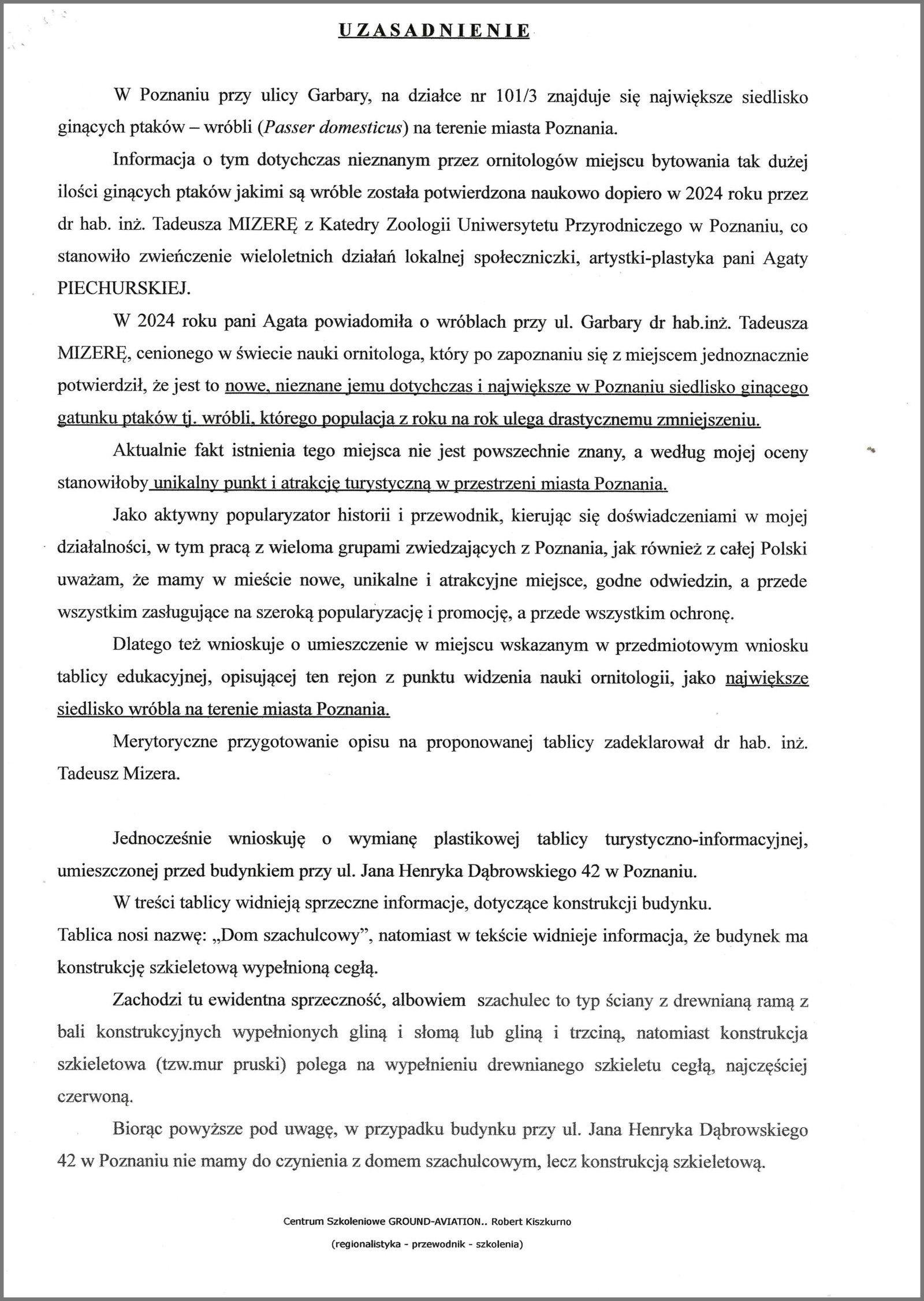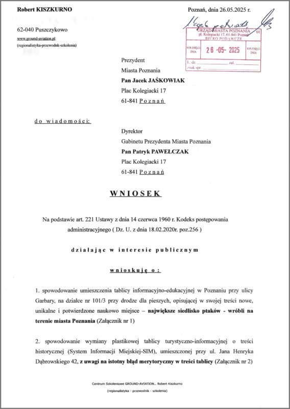 UncategorizedMój wniosek do Prezydenta miasta Poznania o oznakowanie największego w Poznaniu siedliska wróbla domowego i wymiany tablicy informacyjnej na Jeżycach Posted on 3 września 20253 września 2025 by Robert Kiszkurno Mój spacer historyczny pt. „Tajemnice i legendy Pożegowa”. Mój spacer historyczny pt. „Poznań ukryty. Belle Époque. Domy, ludzie, tajemnice”.